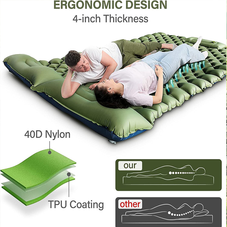 டபுள்-பர்சன் கேம்பிங் ஸ்லீப்பிங் பேட் ஊதப்பட்ட கேம்பிங் பேட். வெளிப்புற சாகசங்களுக்கான இறுதி இரட்டை ஆறுதல். இந்த ஊதப்பட்ட டூ-பெர்சன் கேம்பிங் பேட் சறுக்குவதைத் தடுக்க ஒரு புதுமையான கால்-கட்டுப்பாட்டு வடிவமைப்புடன் விசாலமான ஸ்லீப்பிங் இடத்தை வழங்குகிறது. அல்ட்ரா-லைட்வெயிட் தீர்வாக, இது கேம்பிங் தம்பதிகள் மற்றும் நண்பர்களுக்கு பொருத்தமற்ற பெயர்வுத்திறன் மற்றும் பகிரப்பட்ட ஆறுதலை வழங்குகிறது.
