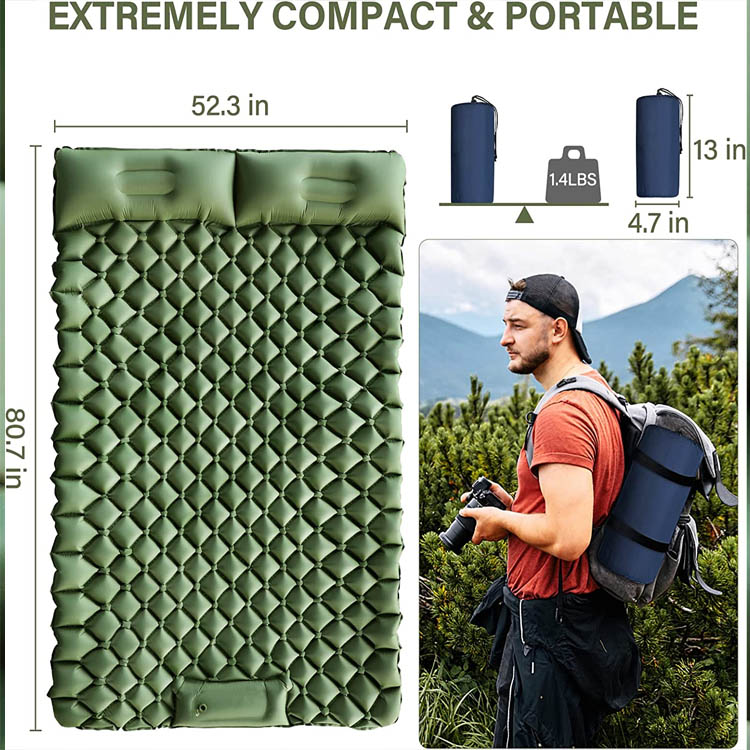 தாராளமாக இரண்டு பெரியவர்களுக்கு வசதியாக இடமளிக்கும் வகையில், இந்த பேட் ஒரு பகிரப்பட்ட தூக்க தீர்வை வழங்குகிறது, இது தனித்தனி பாய்களுக்கு இடையிலான இடைவெளியை நீக்குகிறது, முகாம் தம்பதிகள் மற்றும் நண்பர்களுக்கு தடையில்லா வசதியை உறுதி செய்கிறது.