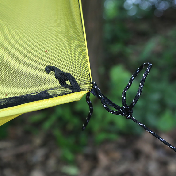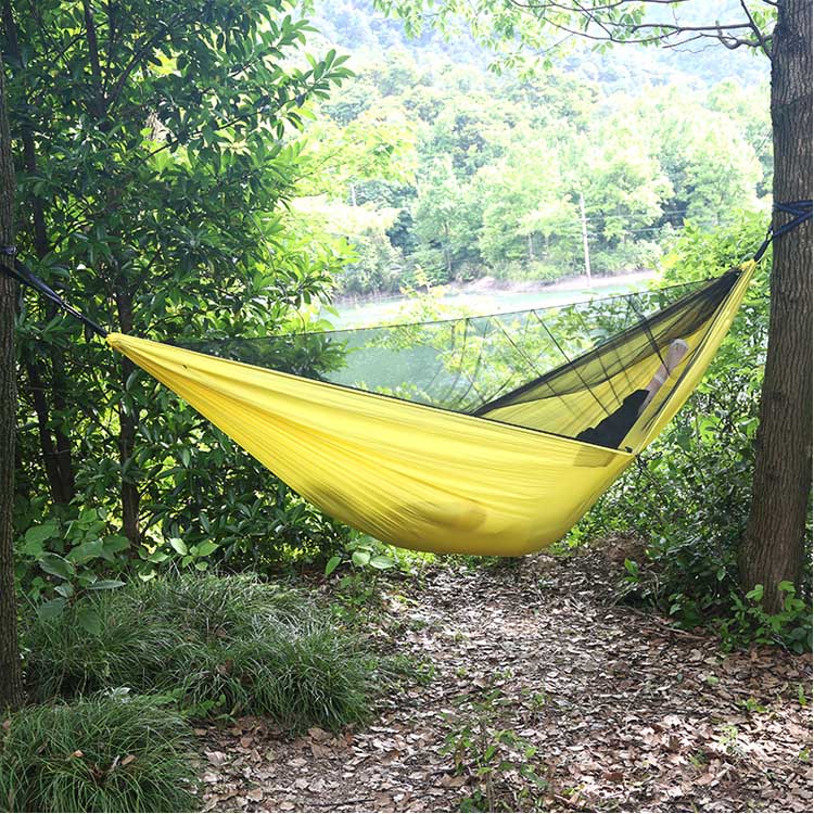 210T பாலியஸ்டர் கொசுவலை வலுவூட்டப்பட்ட விளிம்புகள் மற்றும் 70D நைலான் காம்பால் உடல், சுவாசிக்கக்கூடிய பூச்சி பாதுகாப்பு மற்றும் நீடித்த எடை தாங்கும் திறன் ஆகியவற்றுக்கு இடையே சரியான சமநிலையை உருவாக்குகிறது.