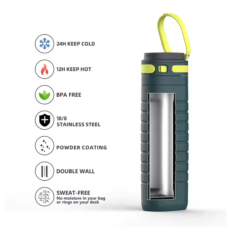 பாதுகாப்பான லாக்கிங் பொறிமுறை மற்றும் சிலிகான் முத்திரையுடன், இந்த பாட்டில் 100% கசிவு இல்லாதது மற்றும் பயணம், முதுகுப்பைகள் அல்லது ஜிம் பைகளுக்கு ஏற்றது. ஒருங்கிணைந்த கேரி லூப் பெயர்வுத்திறன் மற்றும் பாணியை சேர்க்கிறது.