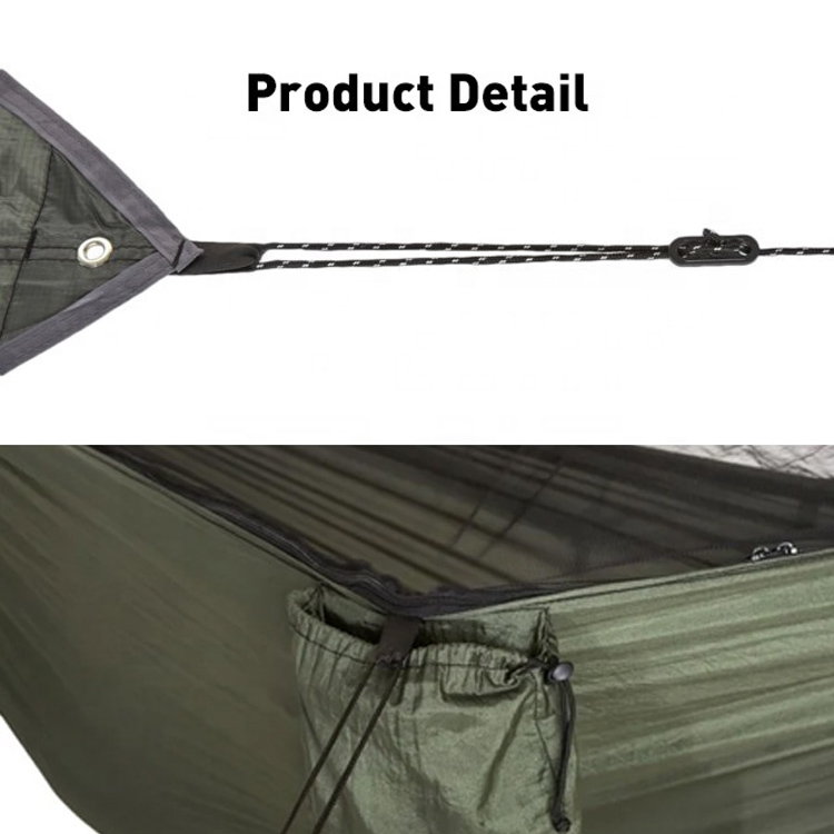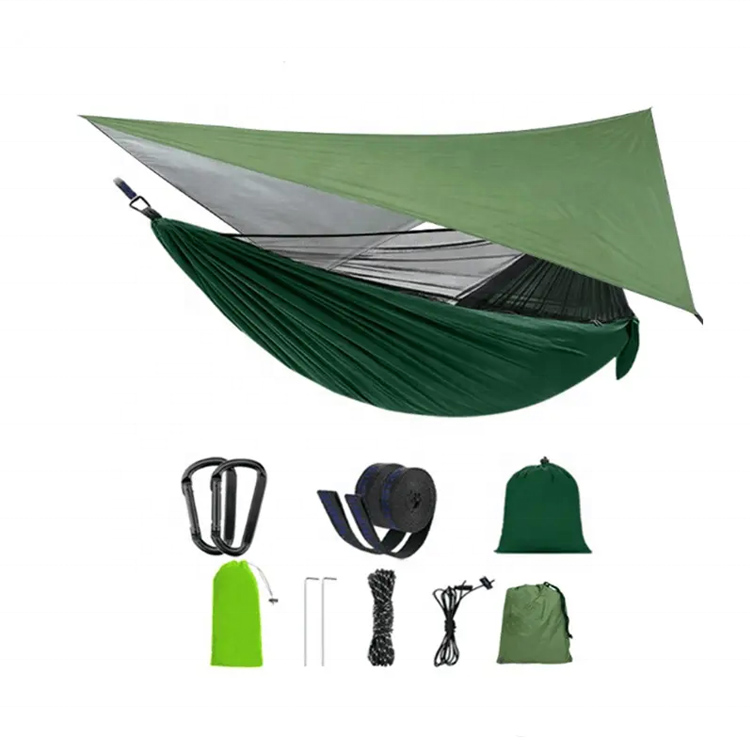 Ultra Light Swing Camping Mosquito Net Rain Fly Hammock. வெளிப்புற சாகசங்களுக்கான உங்கள் அல்டிமேட் ஆல்-வெதர் காம்பால் தீர்வு. இந்த அல்ட்ரா-லைட் சிஸ்டம் ஒரு வசதியான ஸ்விங் காம்பை ஒருங்கிணைக்கப்பட்ட கொசுவலை மற்றும் பாதுகாப்பு மழைப் பறப்புடன் இணைக்கிறது. கேம்பிங்கிற்கு ஏற்றது, இது பல்வேறு நிலைகளில் பிழை இல்லாத தளர்வு மற்றும் உலர் வசதியை உறுதி செய்கிறது.