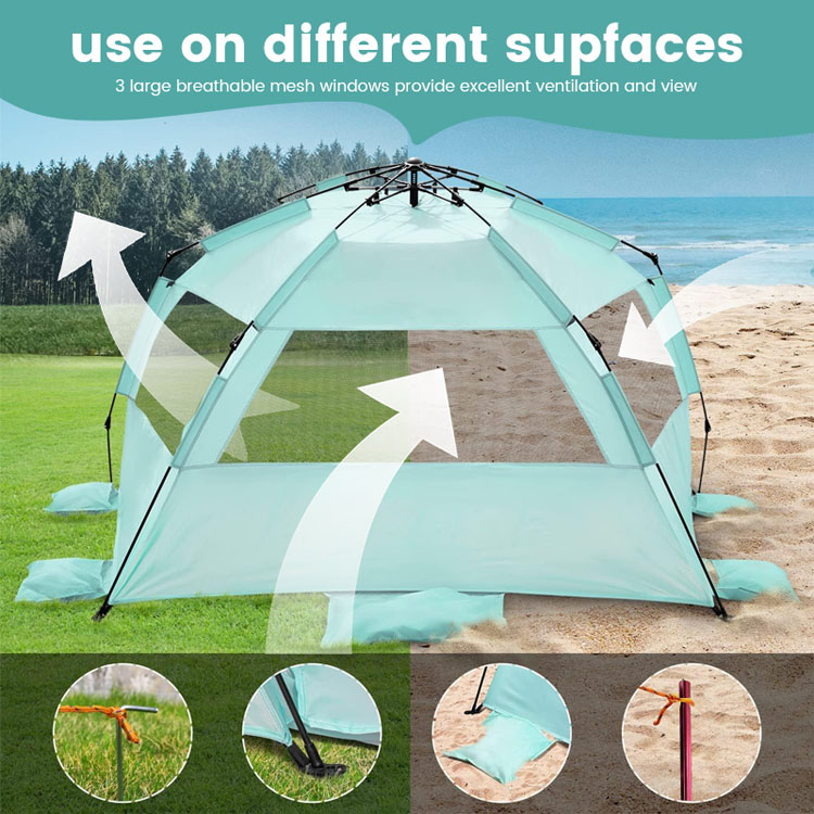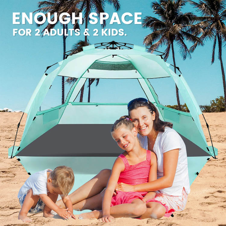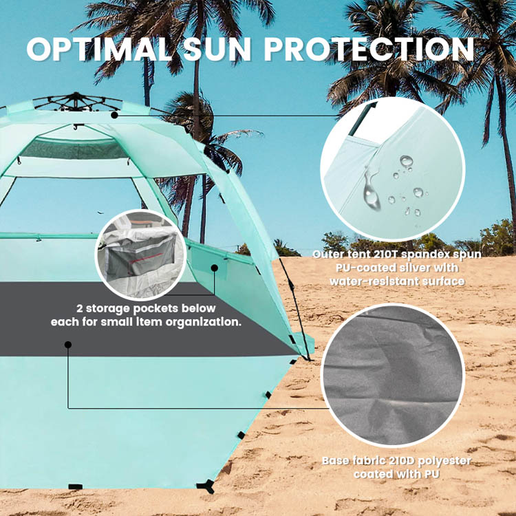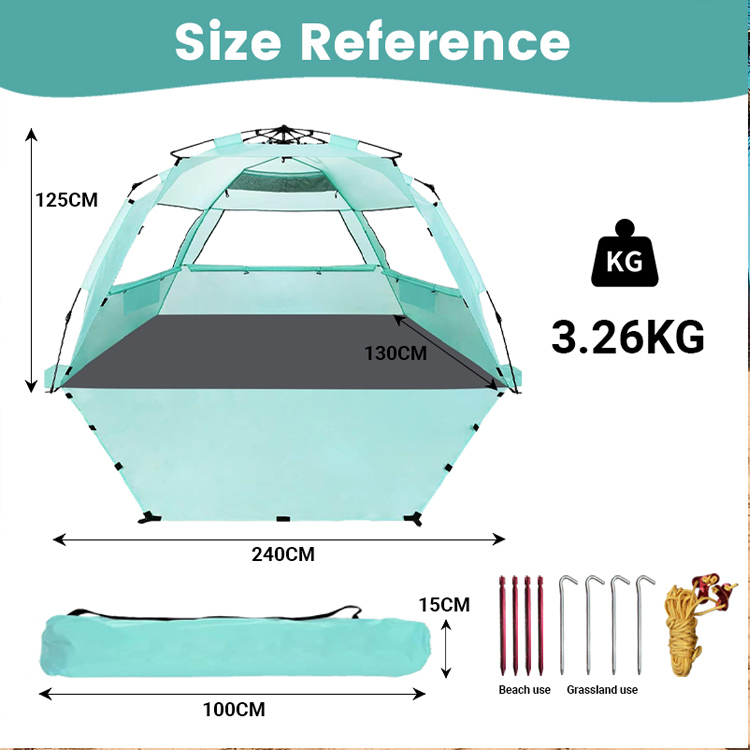 பிரத்யேக வெள்ளி பூசப்பட்ட துணியானது 98% தீங்கு விளைவிக்கும் புற ஊதா கதிர்களைத் தடுக்கிறது, அதே நேரத்தில் சிறந்த காற்றோட்டத்தைப் பராமரிக்கிறது, மேலும் கடற்கரையில் நீண்ட நேரம் தங்குவதற்கு குளிர்ந்த நிழல் தரும் பகுதியை உருவாக்குகிறது.